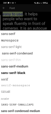 Förbättra din arbetsflöde ytterligare med avancerade organiserings- och redigeringsfunktioner. Skräddarsy din läsupplevelse genom att välja typsnitt, justera text- och bakgrundsfärger för optimal kontrast, och använd full textformatering med fetstil, kursiv, understrykning, markering och textfärg. Organisera dina manus effektivt med obegränsade etiketter och anpassa ordningen med enkel dra-och-släpp-funktion. Snabba inställningar låter dig nypa för att ändra storlek och svepa för att justera opaciteten på det flytande fönstret, med omedelbar feedback. Importera dessutom direkt från urklipp och njut av en helt reklamfri upplevelse som låter dig fokusera fullt ut på ditt framförande.