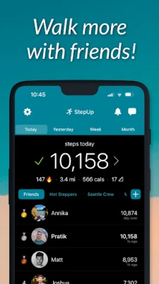 StepUp Pedometer Step Counter är den sociala stegräknarappen som gör träning roligt! Räkna steg, tävla med vänner och bli mer aktiv tillsammans. Gå mer, gå ner i vikt och må bättre varje dag. Spåra din aktivitet automatiskt och uppnå dina hälsomål med StepUp.
