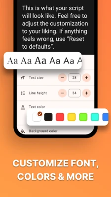 Med Teleprompter blir manushantering och läsning en sömlös upplevelse. Importera enkelt dina texter från PDF, TXT eller Word och anpassa sedan visningen för optimal läsbarhet. Välj bland över 20 olika typsnitt, justera förgrunds- och bakgrundsfärger för att matcha din visuella stil och se till att texten alltid är tydlig, även i utmanande ljus. Funktioner som horisontell och vertikal spegling, stöd för höger-till-vänster-språk och flexibla scrollhastigheter säkerställer att varje inspelning är skräddarsydd efter dina behov. En inbyggd nedräkningstimer ger dig tid att komma i position, och justerbara marginaler skapar den perfekta presentationen. Dessutom möjliggör Teleprompters unika flytande anteckningar-funktion att du kan läsa ditt manus ovanpå andra appar, perfekt för vlogging och intervjuer i full HD, oavsett om du filmar i stående eller liggande format, med smidiga växlingar mellan fram- och bakåtkameror.
