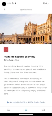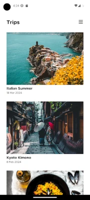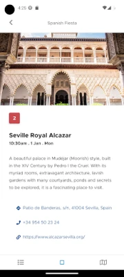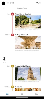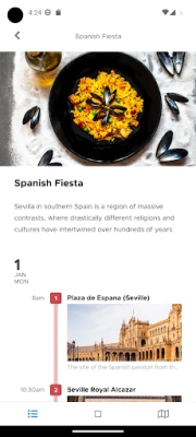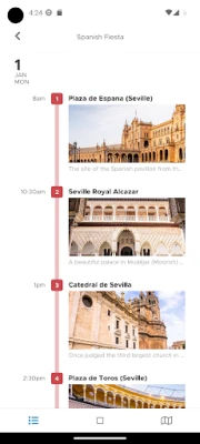 Navigera enkelt genom din resplan med en tydlig dag-för-dag-vy, där alla platser och aktiviteter är överskådligt organiserade och färgkodade per dag. Här återfinns även dina personliga anteckningar och bilder som du har bifogat till varje aktivitet. Ett enkelt tryck öppnar detaljerad information om en specifik händelse, och du kan direkt från appen aktivera kartnavigering, ringa telefonnummer eller besöka relevanta webbplatser med bara en beröring.