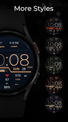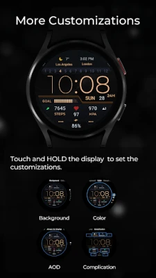 För en sömlös användarupplevelse inkluderar urtavlan två distinkta Always on Display (AOD)-stilar som säkerställer att viktig information alltid är synlig utan att kompromissa med batteritiden. Dessa AOD-stilar anpassas med samma intuitiva steg som bakgrundsfärger och andra element, även om de inte förhandsvisas på samma sätt. Utöver de anpassningsbara genvägarna finns tre praktiska förinställda genvägar för direkt åtkomst till Batteri, Kalender och Pulsmätning – tryck bara för att öppna respektive applikation. Vänligen observera att specifika funktioner och åtgärder för att öppna appar kan variera och kanske inte stödjas av alla enheter.