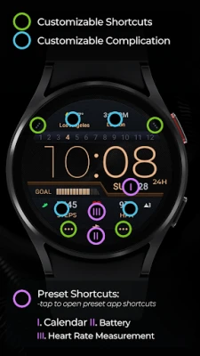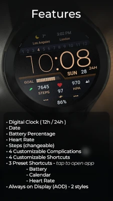 Bortom tid och datum erbjuder denna urtavla omfattande data för att hålla dig informerad om din hälsa och klockans status. Håll koll på batteriprocenten direkt från din handled. Din puls mäts automatiskt var tionde minut, och du kan enkelt komma åt pulsappen via en förinställd genväg, förutsatt att din enhet stödjer det. Antalet steg som tagits under dagen visas också och kan anpassas efter dina preferenser. För att skräddarsy din upplevelse ytterligare har du tillgång till fyra anpassningsbara komplikationer och fyra anpassningsbara genvägar, så du kan snabbt nå dina favoritfunktioner och appar direkt från urtavlan. Anpassning är enkel: tryck och håll nere skärmen och välj sedan anpassningsalternativet för att konfigurera dina visningar.