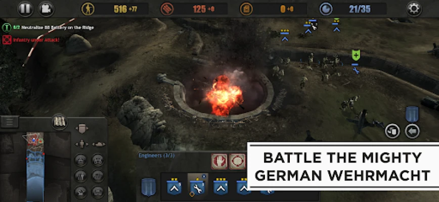 Följ en gripande kampanj genom 15 intensiva uppdrag, från de första landstigningarna på D-dagen till de förödande striderna vid Falaise-fickan. Led dina amerikanska trupper mot den fruktade tyska Wehrmacht i några av andra världskrigets mest utmanande konfrontationer. Med funktioner som det innovativa Kommandohjulet och flexibel placering av taggtråd, är spelmekaniken skräddarsydd för mobilspel. Dessutom tillåter de dynamiskt förstörbara miljöerna dig att strategiskt forma slagfältet till din fördel, vilket öppnar upp för oändliga taktiska möjligheter.
