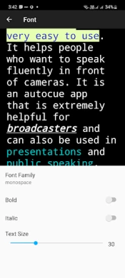 Få total kontroll över din presentation med en rad anpassningsbara inställningar. Justera enkelt rullningshastighet, textstorlek, radavstånd, textbredd och fokus för att matcha din stil och takt. Med stöd för Bluetooth-fjärrkontroller och anpassningsbar tangentmappning kan du styra din presentation trådlöst och med precision. Varje manus kan få sina egna unika inställningar sparade, inklusive hastighet, storlek och fokus, för att eliminera upprepade justeringar. Dessutom finns ett loop-läge för automatisk omstart vid manusets slut, perfekt för övning eller upprepade segment.