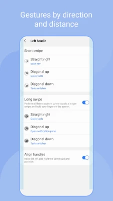 Anpassningsförmågan är central för denna app. Du kan konfigurera en mångfald av åtgärder för både horisontella och diagonala svep, i alla riktningar. När du har bemästrat de korta svepgesterna, öppnas möjligheten att tilldela ytterligare kommandon till längre svep, vilket utökar dina kontrollmöjligheter avsevärt. För att garantera optimal gestigenkänning, oberoende av handstorlek, tumtjocklek eller eventuella skyddsfodral, erbjuder verktyget flexibla inställningar för gestfältets storlek och placering, anpassat för varje unik användare.