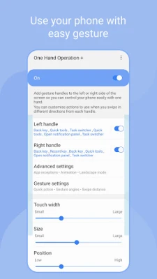 Förenkla användningen av din enhet. Med denna app styr du smidigt alla funktioner med intuitiva tumgester. Njut av en enklare och mer bekväm mobilupplevelse, designad för effektiv enhandsanvändning i vardagen. Optimerar din interaktion med telefonen för maximal bekvämlighet.